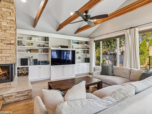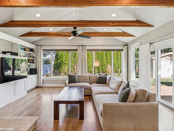Welcome to the Chicago Lifestyle, a Mount Prospect story. This beautifully renovated 4-bed, 2-bath single-family home offers timeless design and modern comfort in one of the most sought-after areas. As you approach, you're welcomed by the inviting charm of the front porch - perfect for a classic porch swing-where you can relax and enjoy the peaceful neighborhood. Situated just a mile from downtown Mount Prospect and Prospect High School, one of the top-rated schools in the state, this home provides the perfect blend of suburban charm and city access. Once inside, prepare to be captivated by the heart of this home-the stunning living room. Designed with both comfort and style in mind, the room boasts soaring 9-foot vaulted ceilings accented with timber beams, an uncommon and impressive feature in ranch-style homes. Natural light pours in from the wall of windows, creating a seamless connection between the indoors and the beautifully landscaped backyard. At the center of the room is a double-sided, wood-burning fireplace with a gas starter, setting the perfect ambiance for cozy evenings. The custom-built entertainment wall adds both functionality and character, offering plenty of space for books, art, or media, making this room the ultimate retreat for relaxation or entertaining. The adjacent open-concept kitchen complements the living space perfectly. Boasting high-end finishes, stainless steel appliances, a large center island with bar seating, and a dedicated pantry for extra storage, the kitchen is as practical as it is beautiful. You'll love the thoughtful detail of the kitchen sink, which overlooks the lush backyard, allowing you to enjoy serene views while cooking or cleaning up. Step outside to the backyard oasis, fully fenced for privacy and featuring a brick paver patio, a small work shed, and a built-in gas line for grilling-perfect for summer barbecues or gatherings. The landscaping is both lush and low-maintenance, making it a peaceful retreat right in your own home. Recent updates, including new windows throughout, a new HVAC system, and a brand-new roof installed in 2021, ensure this home is truly move-in ready. The spacious primary bedroom offers a custom-built closet, while the finished basement features an additional bedroom, a home office area, and ample space for storage or recreation. A one-car attached garage adds extra convenience to the property. Living in Mount Prospect means easy access to everything. From the Metra train station that takes you to downtown Chicago, to the nearby restaurants, shops, and cafes like The Prospect, Patina Wine Bar, and Emerson's Ale House, the area offers the perfect balance of convenience and charm. You'll also love the abundance of park space and nearby Cook County nature preserves, ideal for outdoor enthusiasts. This home is more than just a place to live-it's a lifestyle choice in a vibrant, connected community. Welcome to the Chicago Lifestyle in Mount Prospect.