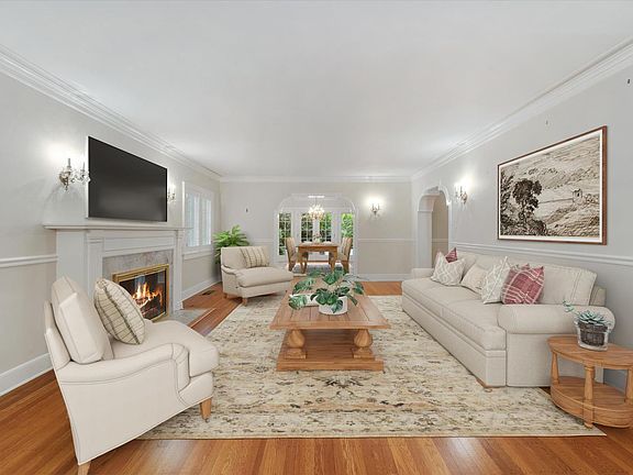 Warm fireplaceBeautifully landscaped backyardLush treesCrystal sconcesLarge windowsTranquil patioEngineered wood floors