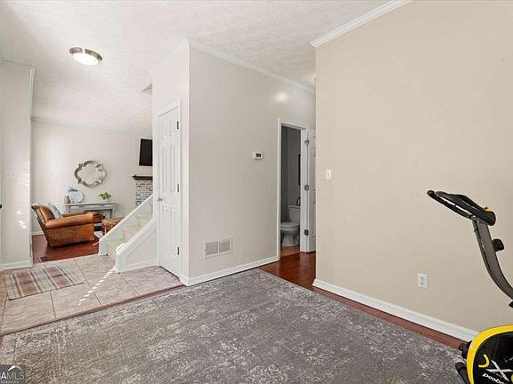 This charming 2-story, 3 BR, 2.5 BA home is located on a peaceful cul-de-sac lot in the sought after Wyngate Subdivision in Towne Lake. Upon entering this home, you will find a large family room with high ceilings and a brick surround gas fireplace. A dining room is also just off the entryway and is ideal for holiday dinners or special celebrations. The kitchen boasts a breakfast bar and separate eating area all overlooking the family room. The kitchen features white cabinets, rustic wood countertops and a stylish backsplash. Appliances include a gas range, dishwasher and refrigerator. This space is both functional and stylish for all your cooking needs. The laundry room and pantry are conveniently located off of the kitchen as well as a half bath in the hallway. On the upper floor you'll find all three bedrooms. The primary boasts a high ceiling allowing for an abundance of natural light! There is plenty of storage too with the walk-in closet. The master bath features a double vanity and separate soaking tub and shower. You'll also love the beautiful wainscot vaulted ceiling. The secondary bedrooms share a full bath with a combination tub/shower. Don't miss the rustic bonus room which is the perfect hangout room or office. You will find engineered hardwoods throughout the house. The large, landscaped backyard is perfect for outdoor entertaining and relaxation. With warm Spring weather just around the corner, the views of the backyard will be especially spectacular when the Hostas, tropical plants and trees are in full bloom which makes for the perfect setting to unwind and enjoy the natural beauty of your surroundings. The bubbling creek runs through the backyard making for a serene setting to enjoy all the benefits of nature. A large deck and patio is the perfect set-up for entertaining family and friends. Another bonus is the beautiful banana trees to the left of the front door that are just waiting to bloom once the weather warms up! This home has it all! With great schools and convenient access to shopping, dining, and minutes to downtown Woodstock, you will love the lifestyle this property has to offer.
