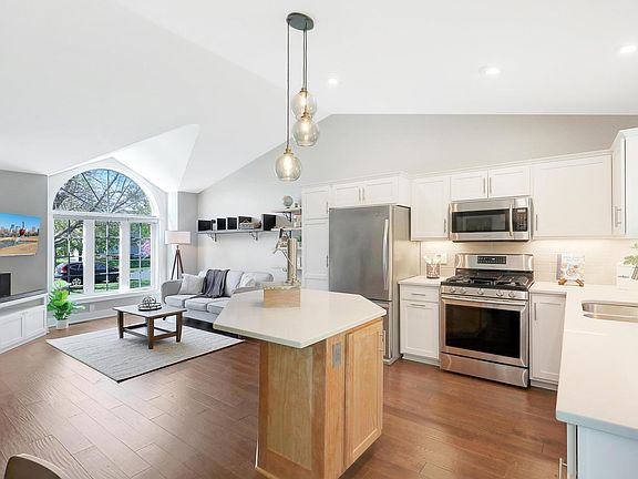 completely remodeled in 2022 including a modern kitchen with new white cabinetry, a custom center island, tiled backsplash, quartz countertops, stainless steel appliances, designer light fixtures, and a custom