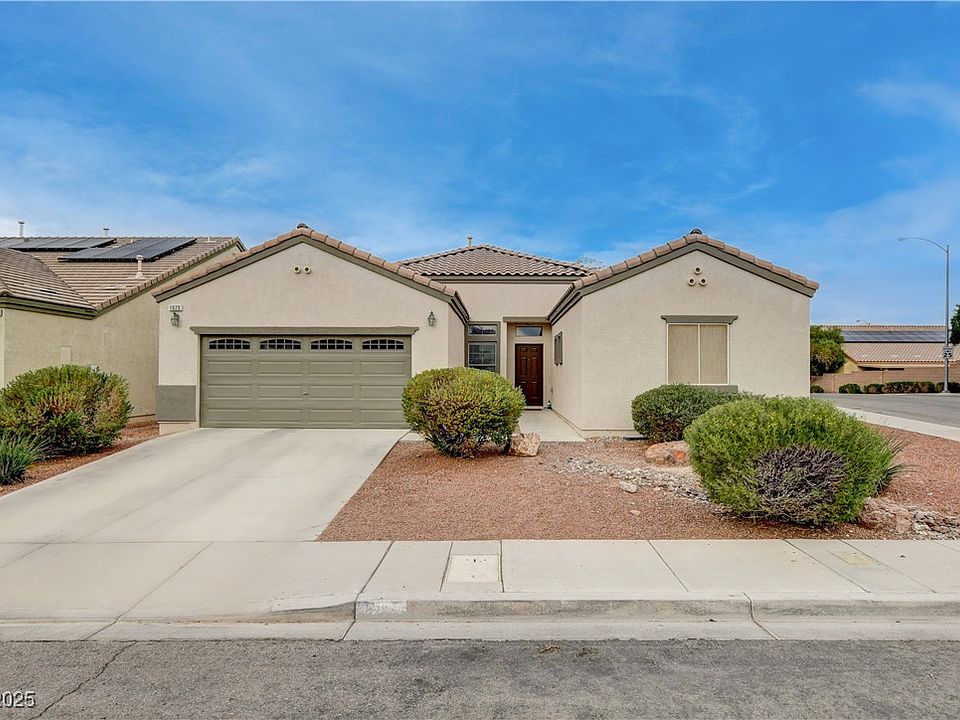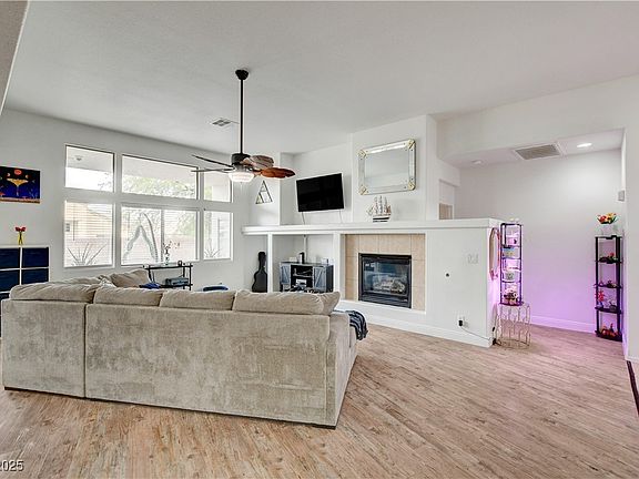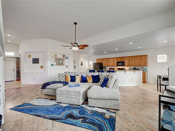 Beautifully maintained 4-bedroom, 2.5-bath home w/covered patio on a corner lot, filled with natural light, laminate and tile flooring throughout, NO CARPET! Very open spacious layout, Kitchen features granite counter tops, a huge walk-in pantry, large breakfast bar and a new refrigerator. Spacious Primary bedroom is separate from the other bedrooms with slider to the backyard patio, has large walk-in closet and primary bathroom has separate shower & tub. New water heater installed in 2024 as well as freshly painted exterior. Location, location, location, this home is close to shopping, restaurants and less than 7 miles to Nellis Air Force Base.