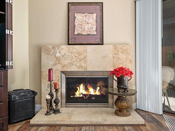 This lovely home has many upgrades including wood floors, refinished fireplace, new kitchen counter tops, newer bathroom fixtures, wet bar in dining room. Laundry hook-ups in closet off patio. One of the largest patio areas with artificial turf, and a gate to the parking area.  Nice complex with mature trees, pool, spa and club house, laundry room, security gated community. Centrally located close to shopping, schools and entertainment.