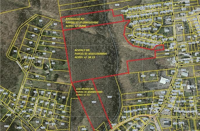 Three parcels FOR SALE with combined +/- 56 acres: (1020 Gringo Rd w/9.7 acres, Beverly Dr w/38.23 acres, Gringo Rd w/7.8 acres). Multiple access points to these parcels from separate roads.