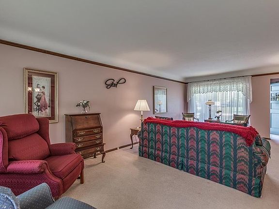 Welcome to this charming home with comfortable living room! Walk in from the relaxed porch into the ceramic floored foyer with coat closet. The L-shaped living room/ dining room can be made into a large open space perfect for entertaining, or can be made into a cozy living space. This space features carpet with the option of hardwood floors beneath and access to backyard. Beautiful updated master bath with ceramic floors. Eat-in-kitchen with ceiling fan and pull out pantry makes storage easy and convenient. A first floor half bath is convenient for guests coming in from the garage. Three bedrooms with neutral decor all consist of carpet with hard wood floors ! One bedroom has been freshly painted with newer carpet (2016). Basement with updated electrical panel is freshly painted and spacious with plenty of areas for shelving and storage, glass block windows, work shop area, and large laundry room with a potential family room! Attached 2 car garage is spacious with overhead storage area and outside access door. The peaceful backyard adds to charm of this home! Close to park, shopping mall, and downtown Cleveland. One year sellers paid home warranty and all appliances included.