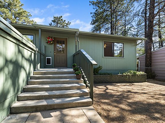 This quintessential, south-facing Prescott Cottage is nestled among the tall Ponderosa Pines yet close to Historic Downtown Prescott, shopping, schools, and medical services. Freshly painted inside and out and outfitted with modern conveniences, the home still features the charms of when it was originally built. The good-sized bedrooms with large closets. Efficient kitchen with newer appliances, easy-glide drawers & copper pulls, a double sink with garbage disposal, and pass-through window to the dining room. Large family room. Bathroom with new faucet & shower head. The bonus room and laundry (not included in home's square footage) with access to the backyard could be an office or craft room and the dog door there will give your pup the freedom to come and go.
