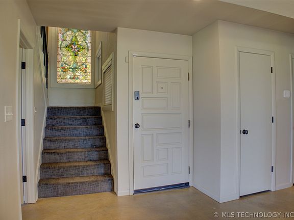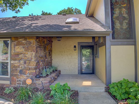 Awesome contemporary home on a corner lot backing to the 7th hole of South Lakes Golf Course, Stunning views of the downtown Tulsa Skyline and Riverside Jones Airport, Huge vaulted Great Room with a wood ceiling and beams and walls of windows, massive stone fireplace, kitchen opens to Great Room with a skylight, Custom concrete finished floors, Saltwater pool with new pool deck, Vivant smart home system, sprinkler system, huge mudroom with multimedia desk and shelves, hall bath has an exterior door to go to the pool along with the second bedroom down, The master is 22x19 with Control Tower windows to take in the stunning nighttime views and watching planes land and take off, Stain Glass window in the stairwell was from an old church, This is Truly one of a kind property!