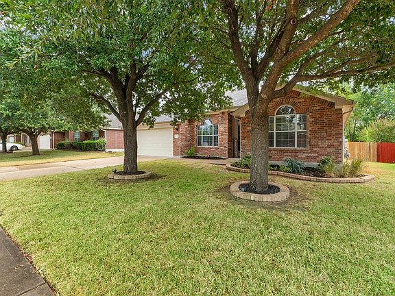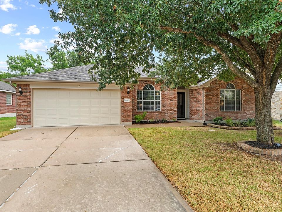 Welcome to your serene Pflugerville retreat! This well maintained charming 3-bedroom, 2-bathroom single-story home boasts a well manicured front yard featuring twin trees and comprehensive full gutters protecting the exterior. Inside, discover a bright, open-concept layout with modern, luxury vinyl plank flooring throughout the common areas. A versatile additional living/flex space off of the entryway awaits your personal touch. The spacious living room showcases a cozy fireplace. Seamlessly flowing into the kitchen and dining areas, this open layout is perfect for entertaining. The kitchen has granite countertops, stainless steel appliances, recessed lighting, a large pantry, and a classic subway tile backsplash. A breakfast bar overlooks the kitchen, perfect for casual meals or chilling. Adjacent to the kitchen, the bright dining area has direct access to your expansive outdoor oasis. The backyard includes a large covered patio with a ceiling fan, additional patio space, and a fully fenced yard backing to a serene green belt – ideal for outdoor gatherings, relaxation, and fun with family/friends. Retreat to the primary bedroom where the peaceful backyard view creates a calming atmosphere. The en-suite bathroom offers dual vanities, a deep soaking tub, a walk-in shower, tile flooring, and a spacious walk-in closet. The two secondary bedrooms are generously sized, each with a walk-in closet. Enjoy community amenities including a playground, pool, and scenic trails for walking, hiking, and biking. Conveniently located near parks, restaurants, schools, Lake Pflugerville, and with easy access to highways 45 and 130, this home offers the perfect blend of comfort, style, and convenience.