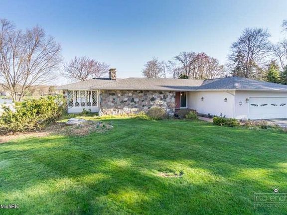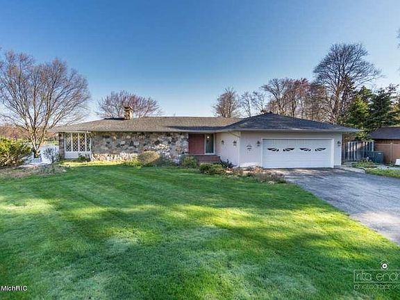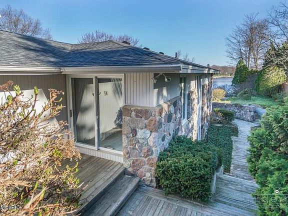 Beautiful 5 bedroom 3 bath custom built home down private road with 144' of Mona Lake frontage. Home features 100 tons of Wisconsin split field stone along with walnut, wormy oak, red oak, and pine wood throughout. Large hallways and front entrance welcome you into the 5300 sq ft. of living space in the home. Six slider doors open up to the phenomenally landscaped back yard overlooking the lake and custom built Garter pool with waterfall. Extra tall ceilings in the lower level make the rooms fee l even more roomier than they already are. There are two real wood fireplaces, an indoor grill, two huge storage rooms, and a wet bar in the home. The beach is great frontage having a sea wall all the way across the frontage with a 60' dock that has been dredged to handle larger boats.