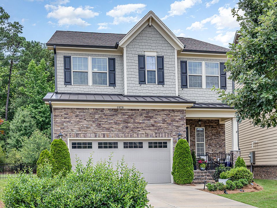 Beautifully maintained 4-bedroom home on a quiet cul-de-sac with a huge fenced backyard. The main floor features hardwoods throughout, a spacious kitchen with stainless steel appliances, quartz countertops, oversized island, walk-in pantry, and a cozy gas fireplace. Additional highlights include a tankless water heater, half bath, and Green Living Certification. Upstairs you'll find a large primary suite with tray ceiling, spa-like bath with marble counters, dual vanities, frameless shower, and walk-in closet. Three additional bedrooms (two with walk-in closets), a full bath, and a third-floor bonus room with custom media center and full bath offer ample space for family and guests. Enjoy outdoor living with a screened porch, large deck, and private wooded backdrop. HOA covers lawn care, landscaping, roof, siding, gutters, painting, and more. Conveniently located near Koka Booth Amphitheatre, Symphony Lake, Whole Foods, Lifetime Fitness, Fenton, Downtown Cary Park, and just minutes to Raleigh and RDU Airport.