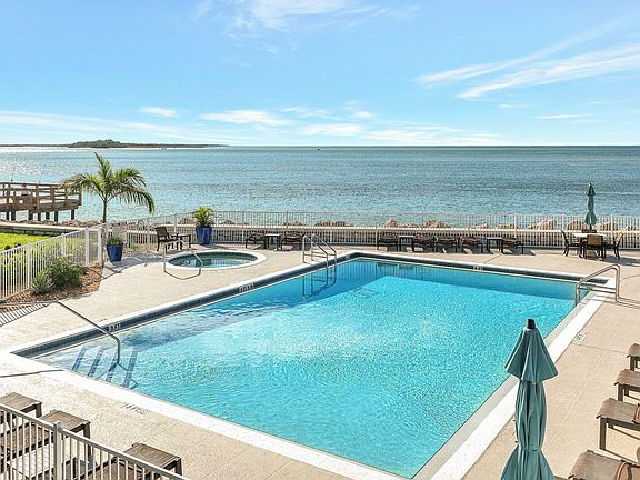 The exquisite residence features a palatial owner's retreat with captivating views, direct lanai access, a substantial walk-in closet, and a spa-inspired ensuite with a soaking tub and separate shower. The chef-inspired kitchen boasts coastal white cabinetry, stainless steel appliances, and granite countertops. You'll find abundant storage, including a dedicated laundry room and two exterior closets. Embrace a coveted resort lifestyle with exclusive access to a newly designed fishing pier, a heated pool and spa, tennis-pickleball court, a fitness center, and a social room. This is an unparalleled opportunity to acquire a prestigious Gulf-front residence where value meets exquisite coastal living.