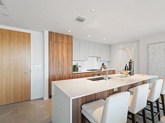 This penthouse residence offers 1,419 square feet with open floor plans and 9'8" ceilings. Located on the sixth floor with energy-efficient lighting solutions, fabulous designer finishes, oversized quartz countertops, a waterfall island, top-of-the-line appliances including Gaggenau and Bosch: gas cooktop, wall oven, refrigerator, dishwasher, and trash compactor. Luxurious "spa-like" owner's bath with oversized showers and lavish tubs.