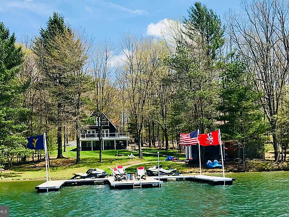 Lakefront chalet home in a peaceful cove with sunset views! This 5 bedroom 3 bath, 2 fireplace lakefront retreat has been updated and offers plenty of indoor and outdoor living spaces. Located on the non commercial southern end of the lake and within a few hundred yards of the incredible Thousand Acres Golf Course, now with 18 holes. Perfect for all water activities including sailing and kayaking. Includes dock, storage buildings etc. DISCLOSURE: RAILEY REALTY IS NOT THE CARETAKER OF PROPERTIES LISTED BY IT. DURING INCLEMENT WEATHER CONDITIONS, PROSPECTIVE PURCHASERS AND THEIR AGENTS ASSUME ALL LIABILITY ASSOCIATED WITH OR BY WEATHER AT THE PROPERTY.