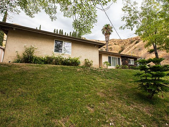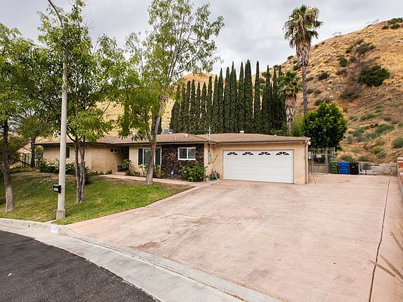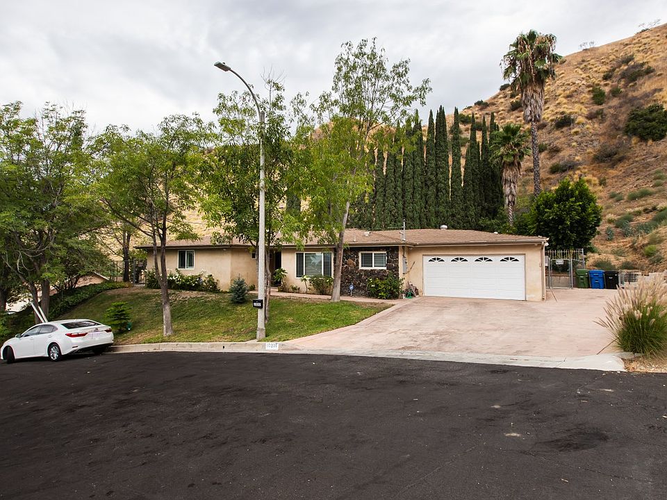 At the end of a peaceful cul-de-sac in Sun Valley is this lovely 3-bedrooms, 2-bathrooms, 1,571-SqFt home with attached garage could become yours! With a neat walkway leading you to a modern glass-inlay front door, welcome inside to a bright living room and adjoining dining room featuring recessed lights, crown molding, a decorative stone accent wall with fireplace, warm tone floors, and sliding door access to the spacious backyard. Venture into the luminous kitchen where granite counters, ample cabinetry, built-in stainless-steel appliances, and kitchen island/breakfast bar with a statement granite countertop and built-in wine rack enhances your culinary experience. The wonderful primary bedroom includes a walk-in closet, windows edge seating area with storage, and an en-suite split bath offering a separate sink and vanity space enhanced with granite counters. The secondary bedrooms have interior window shutters while one has a built-in closet space. Plus, the main bathroom is sleek with modern plumbing fixtures, glass tile accent backsplash, and tiled shower/tub. Journey to the backyard to discover the lovely neighboring hills, open patio space with firepit, grassy areas, and even a BBQ kitchen complete with stunning awning having two ceiling fans, recessed lights, and stylize wood ceiling. This backyard is a perfect outdoor entertainment space for any event! Only a short drive away from local markets, shops, dining, schools, and more!
