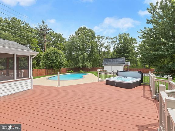 Nestled on a quiet cul-de-sac, this beautiful Colonial sits on a spacious premium 1/2 acre lot and showcases a private resort-style backyard featuring a heated swimming pool, new hot tub, and a two-story shed with solar pool heating. The expansive deck overlooks a level, privacy-fenced yard that backs to trees and includes a dedicated vegetable and herb garden—perfect for entertaining or relaxing in your own oasis. Inside, the thoughtfully designed interior is filled with updates, including a remodeled kitchen, and fresh interior paint throughout. The inviting living and dining rooms feature gleaming hardwood floors, while the remodeled kitchen boasts granite countertops, wood cabinetry with a large pantry with pull-out shelving, an island, and a sunny breakfast area with access to the deck. The spacious family room offers a cozy, woodburning fireplace with a striking black stone adjoined by a built-in bookcase, and French doors that open to the screened in porch. Upstairs, the primary suite impresses with a custom walk-in closet and spa-inspired bath featuring dual granite vanities and an oversized step-in shower with decorative tile inlay. Three additional bedrooms and a full hall bath complete the upper level. The finished lower level provides flexible living space with a large recreation room, half bath, and a generous storage room. A spacious two-car garage includes a second refrigerator/freezer for added convenience. Ideally located close to major commuter routes, shopping, dining, and entertainment, this is the perfect blend of comfort, style, and convenience. Welcome home!