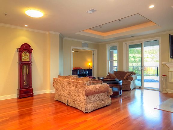 Luxurious Branson Landing suite with gorgeous lake front view! First time on the market for this one-owner condo. Features galore, including gas fireplace, wet bar, granite countertops, hardwood floors, modern fixtures, all appliances, two master suites with Jacuzzis and additional butler's kitchen. Enjoy time out on the oversized deck overlooking broad views of Lake Taneycomo and beautiful Ozark Mountains. Includes two reserved parking spaces in the Branson Landing parking garage conveniently located close to private elevators. Amenities include indoor pool, fitness room, upscale shopping, dining, lakefront access, and walking trails. Home warranty included.
