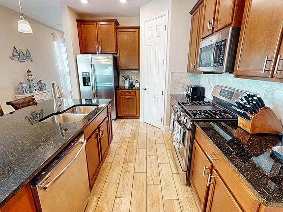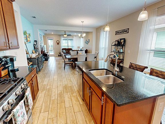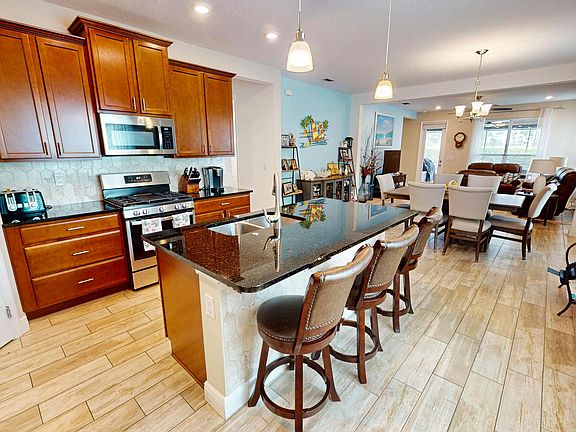 This 3-bedroom, 2-bath home offers just under 1,700 square feet of open living space with a thoughtful split floor plan, ideal for hosting family and guests. The true highlight is the stunning oversized screened lanai and pool area. Featuring a sparkling heated pool, expansive covered space with room for seating and a TV, hurricane screens, and upgraded landscaping, this outdoor retreat provides the ultimate in privacy and relaxation--perfect for year-round Florida living and entertaining. Inside, the kitchen overlooks the dining and family rooms and is beautifully appointed with granite countertops, 42-inch cabinets, a gas range, and an upgraded backsplash. The oversized master suite boasts dual sinks, a large walk-in closet, and a seamless glass walk-in shower, while the second and third bedrooms are perfectly suited for guests. Additional features include impact windows and doors, upgraded recessed lighting, and thoughtful finishes throughout. With its seamless indoor-outdoor flow and showstopping lanai, this home is truly built for entertaining and comfort.