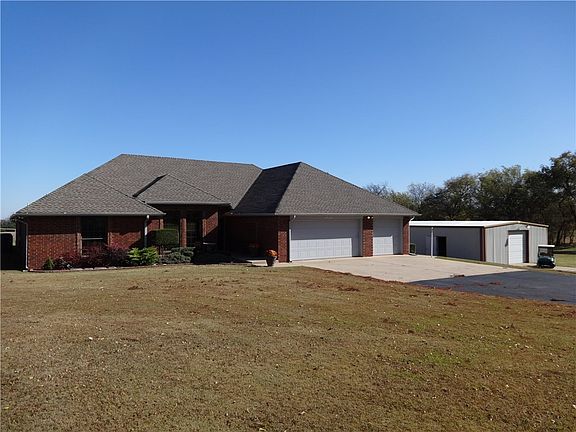 Fabulous 10 acre property near town! Beautiful one-owner home that has been loved and well cared for. 30' x 50' metal building w/ concrete floor, 1000' feet of pipe & cable fencing, and back 5 acres has it's own well. Extra large covered patio faces gorgeous view East! Other amenities include: 10 Person storm shelter, 2 heat pumps, 2 dining areas and 2 large living areas, vaulted ceilings, beautiful woodwork, tinted windows, Jack and Jill bathroom, huge master with master bathroom having 2 vanities, Jacuzzi tub, shower, and his and hers closets, newer double range, and 2 newer HWT. Rare to find 10 acres so close to Yukon, Piedmont and OKC-WENT PENDING DURING PROCESSING,