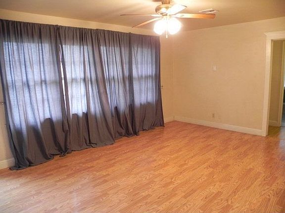 Great starter house in a wonderful location. Third bedroom is converted garage, but could be den. Has fireplace. New flooring in kitchen,bathrooms and den/bedroom. Laminate flooring in good condition. Large living space, large dining space, good kitchen. Utility room off back yard. There is an entry from the alley and a carport in the rear of the house. Privacy fence.