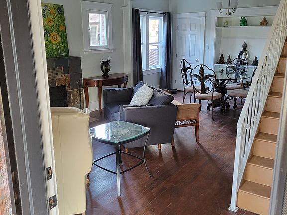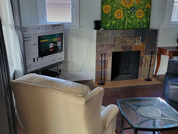 Large, downstairs bedroom with queen bed, some furntiure (room can be empty for move in), large closet, windows and shared hallway bathroom in this recently renovated 4/2 historic brick home. Common areas furnished, bedroom is partially furnished. Shared living room, kitchen with refrigerator/icemaker, kitchen wares, extra frig, inside laundry.