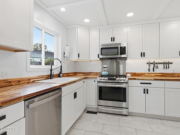 Beautiful gas rangeNew stainless steel appliancesButcher block countertops