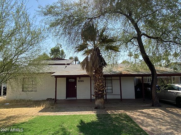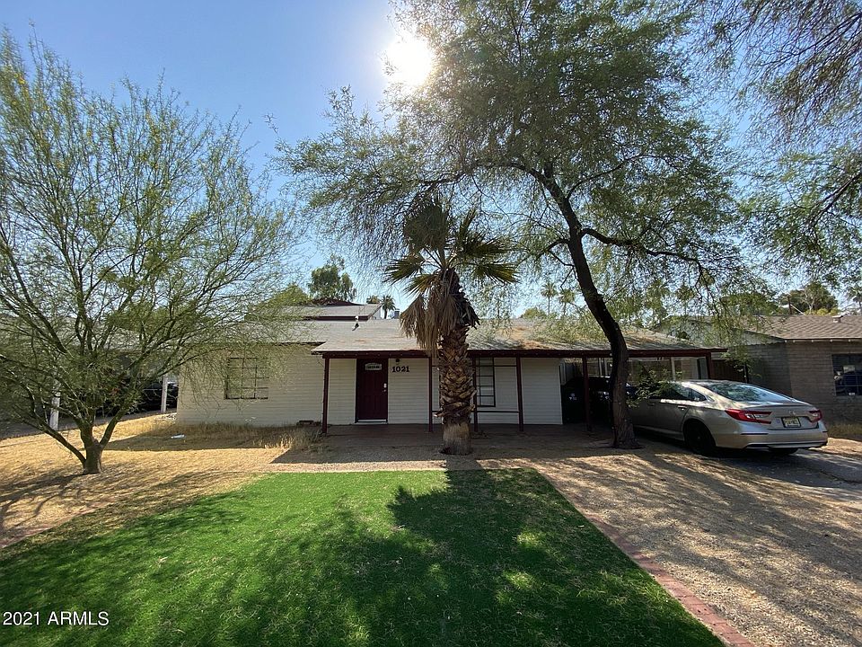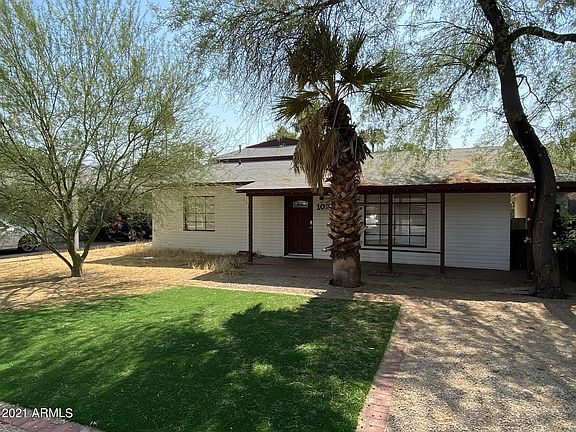 Enter family room to eat-in kitchen and Arizona room with French doors leading out to backyard with patio and storage shed. Living room features wood burning fireplace. 2 guest bedrooms on first floor PLUS a possible 3rd bedroom with closet and 2.5 bathrooms. Upstairs is another large bedroom and what could be a walk in closet, 5th bedroom or office. Covered parking and laundry. Excellent location near light rail and ASU