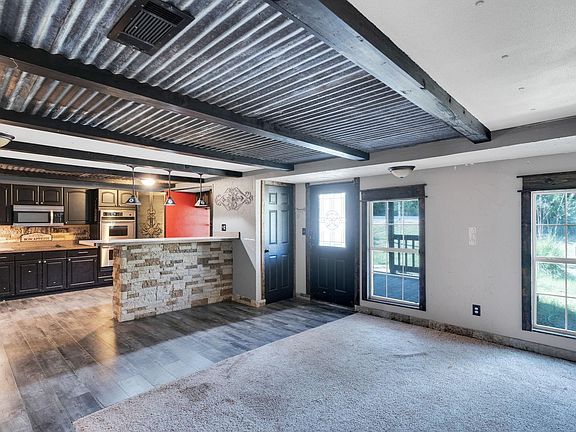 Inside, the home blends cozy farmhouse warmth with a modern edge. The living area feels open and relaxed with exposed wood beams and a corrugated metal ceiling that adds personality and texture. The kitchen is built for both everyday living and entertaining, featuring stainless appliances, double ovens, and plenty of counter space to cook and gather.