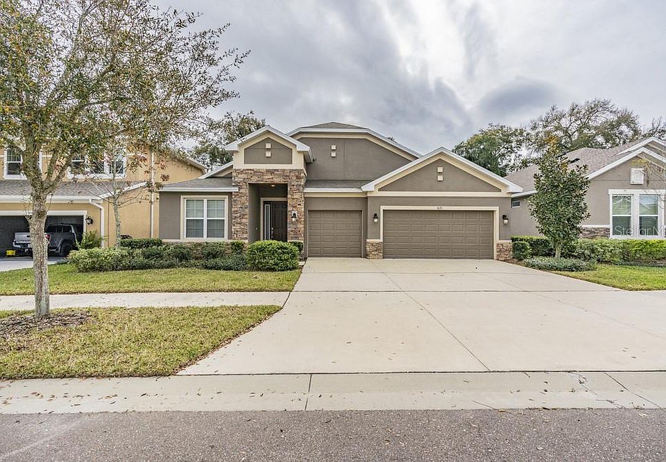 Incredible 4 bedroom, 3 bathroom, with many upgrades located in the gated Reserve at Hunters Lake community! This freshly painted home features and open floor plan with brand-new carpet in the bedrooms and tile throughout the common areas. The first bedroom and bathroom could act as a guest suite with updated lighting and quartz countertops in the bathroom. You are greeted with a large dining room that leads into the beautiful kitchen with granite countertops, stainless steel appliances, large island, bar seating, white cabinets, and ample counter space. The kitchen is also equipped with 2 pantries, breakfast nook, and direct access to the 3 car garage! Walking through the large living space you have split bedrooms and sliding door access to the gated backyard! The 2 spare bedrooms share a bathroom with a huge tiled stand up shower. Across the living room is the owner's suite that features a massive walk-in closet with custom built in shelving, large duel vanity sinks, and a tiled stand up shower. This home features crown molding throughout, ceiling fans, sliding doors, recessed lighting, and walk in closets. This home is minutes from the heart of Brandon where there is ample shopping and dining options, malls and shopping centers, and access to major highways for commuting.