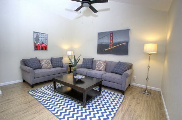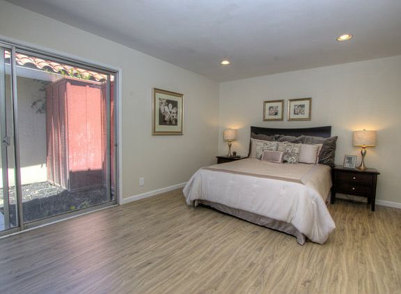 Stylish and updated one level townhome with large patio and attached 2 car garage. Home is bright with multiple sliding glass doors leading to private patio. Home features remodeled interior with designer touches, vaulted ceiling, sun tunnels, recessed lighting. Spacious master bedroom with lots of closet space. Large kitchen with granite countertops, tile floors.