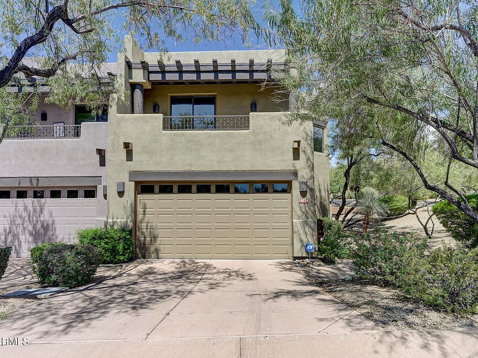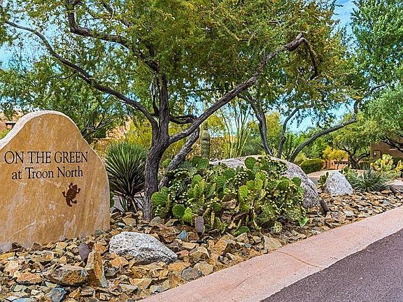 Recently remodeled town home in Troon North's prestigious On the Green neighborhood . This 3 bedroom 3.5 bath residence offers en-suite bathrooms, with a generous main floor master featuring a custom Classy Closets system and Jacuzzi shower. Upstairs, two additional bedrooms and baths accompany a versatile loft, ideal as office space. The open great room integrates a modern kitchen boasting quartz counters and Bosch appliances with a breakfast bar and dining area. Enhanced by porcelain wood look tile flooring, updated bathrooms, electric Hunter Douglas blinds, new ceiling fans, a new water heater, and brand new AC units, this home is move-in ready. Steps from the clubhouse and Dynamite Grill, residents enjoy, a heated community pool, fitness center, and BBQ area. Premier shopping and dining are nearby.