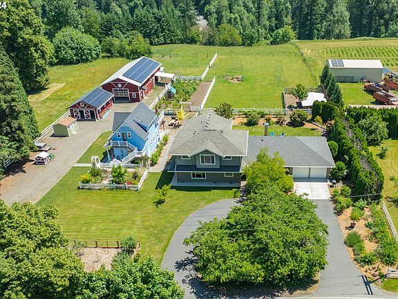 Follow the Willamette River a short distance south of Oregon City, you will come to the historic community of New Era. An idyllic rural setting, just minutes from Canby area shopping, dining, recreation, and schools, this spacious main house has recently undergone a complete renovation, with territorial views stretching to Mt Hood. The guest house has been re-built from the ground up, now providing an ADU upstairs (one bedroom apartment, full bathroom w/bubble tub, with kitchenette and European washer/dryer) for rental income or multi-generational living, and a main floor farm processing kitchen (double built-in ovens, microwave, cooktop, insta-hot water), ready for the next harvest and parties too (wall of windows folding glass door open to large covered outdoor entertaining area - perfect for event/party/weddings).The brand new 2,160 sf barn plus the original 600 sf shop/barn support 78 solar panels, ample room for toy storage and livestock. The poultry coop (egg production), green house with gardens, orchard, and grape/berry vines produce plenty to sell in the farm stand.This hobby farm has it all, from power and water run to all buildings, to capturing rain water into a thousand gallon holding tank for garden use, RV parking w/electrical and water hook-up.