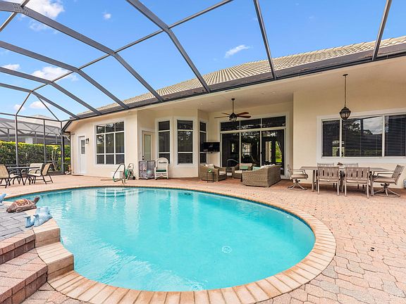 Nestled in the coveted Cypress Point sub-community of PGA Village, this pristine 3-bedroom, 3-bathroom Ecclestone built home offers 2,818 sq. ft. of luxury. Primary suite overlooking pool, closet cabinets & pullouts in bath. Two ensuite guest rooms & fully updated bathrooms with quartzite counters & frameless glass showers enhance the home's elegance. Home office features custom cabinets & woodwork. The pool, resurfaced in 2024, is ideal for relaxation and entertaining. Located within the renowned 54-hole PGA Golf Club with cart path access, it's a golf lover's dream. Additional upgrades include central vac, tile & wood floors, cabana bath, 2021 water heater, humidistat, attic ladder CBS construction, . A true gem in PGA Village!