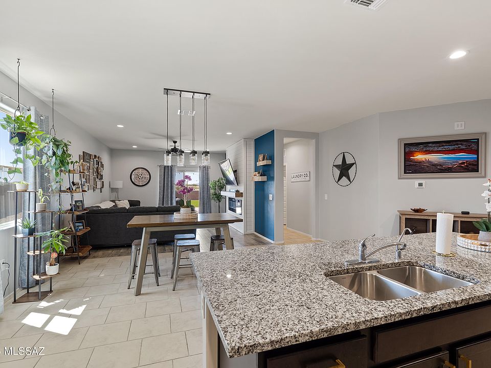 Discover this nearly new 4-bedroom, 2-bath home in the sought-after Saguaro Bloom community. Built less than 3 years ago on a premium lot, the property offers unobstructed desert and mountain views. Inside, the open floor plan features a stylish kitchen with granite counters, updated flooring, and a cozy added fireplace in the living room. Spacious bedrooms and modern finishes throughout provide comfort and function. Step outside to a newly landscaped backyard designed for relaxation and entertaining. Enjoy community perks including 2 pools, parks, and close proximity to I-10 for easy access.