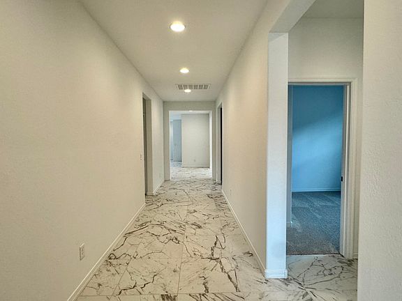 Step inside to discover elegant geometric marble tile flooring flowing seamlessly throughout the foyer, kitchen, owner's entry, bathrooms, laundry room, hallways, dining area, and gathering room—offering timeless style and low-maintenance living.