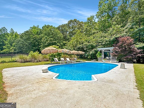 Privacy, Land, Upgrades, and a Pool = Your Own Slice of Paradise! Tucked away in the peaceful landscape of Chattahoochee Hills, this charming home rests on nearly 5 acres of scenic countryside. Step inside to a welcoming, light-filled living room that flows seamlessly into the dining area and kitchen, complete with a spacious pantry. On the opposite side of the home, your primary suite is a true retreat, featuring high ceilings, a large soaking tub, double vanities, a separate tile shower, and a thoughtful bonus...the laundry room is conveniently located right within the suite for added ease! Two additional bedrooms and a full bath round out the main level, offering smart functionality for everyday living. Upstairs, discover a sun-drenched oversized fourth bedroom with a walk-in closet and generous walk-in attic storage space. The detached two-car garage includes 30 Amp RV charging, workshop space, and extra storage connected to the main home by a breezeway that leads to your sparkling in-ground pool, perfect for summer days and peaceful evenings. If privacy, nature, and a slower pace of life are calling your name, this is the home you've been searching for. Just minutes from Serenbe, this location perfectly blends rural tranquility with modern-day convenience.