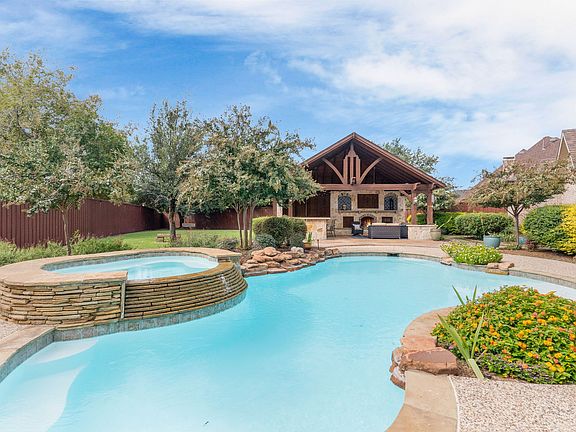Stunning Custom Murphy Home in The Trails of West Frisco on a Rare .38-Acre Lot with an Outdoor Oasis! This beautifully updated home offers the ultimate in indoor-outdoor living with a resort-style backyard featuring a pool, spa, and nearly 700 sq ft of covered outdoor living space complete with a built-in grill, refrigerator, and fireplace—perfect for entertaining year-round. Inside, the remodeled kitchen showcases white cabinetry with illuminated upper cabinets, striking stone countertops, a large center island, Blanco sink, gas cooktop, double ovens, walk-in pantry, and a dedicated wine bar area. The flexible floor plan includes a spacious primary suite and a private guest suite on the main level, plus two separate office spaces—one of which could easily serve as an additional bedroom. Upstairs, you'll find two more bedrooms, a large game room, and a dedicated media room. Media room has both a window and closet so could instead be a large 5th bedroom. Move-in ready with brand new carpet. Additional features include a 3-car garage behind a gated driveway for added privacy and security. Backyard has both artificial turf and natural grass.