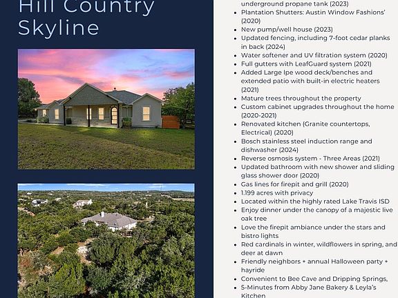 Over $200,000 in curated upgrades since 2020, this coveted West Cave Estates + Lake Travis ISD blends high-end functionality with serene Hill Country living. Beyond the wrought iron entryway, you're welcomed into an elegant interior, where the chef’s kitchen anchors the home with abundant counter space, granite countertops, a Bosch induction range and dishwasher, pullout shelving throughout, and a reverse osmosis system serving the sink, beverage room, and refrigerator. The formal dining area is ideal for entertaining, and includes a butler’s pantry complete with a wine fridge. Office space included! The living room impresses with coffered ceilings, a stone fireplace, and a shiplap accent wall, while the primary suite offers a luxurious retreat with a spa-style tub and double vanity. Sophisticated upgrades extend throughout, including custom wood plantation shutters, upgraded electrical, Pottery Barn mirrors, and designer hardware. The laundry room offers upper cabinetry and pullout storage, and the secondary bath was reimagined with a walk-in shower and sliding glass door. Outside, the magic continues with an extended patio, Ipe wood deck, built-in gas firepit, electric heaters, and bistro lighting under a majestic live oak. Additional features include a whole-house Generac generator with underground propane tank, a new well house, leaf-guard gutters, and full fencing with 7-foot cedar planks for privacy. Enjoy visits from deer, spring wildflowers, and red cardinals in winter. This neighborhood offers more than just a beautiful setting; it provides a genuine sense of community. Neighbors have become friends over time, gathering for daily walks, friendly chats, and the occasional tail-wagging companion in tow. Each fall, the annual Halloween party and hayride bring the entire street together. Equidistant to Bee Cave and Dripping Springs and just minutes from Abby Jane Bakery and Leyla’s Kitchen, this home delivers the ideal balance of luxury, comfort, and lifestyle.