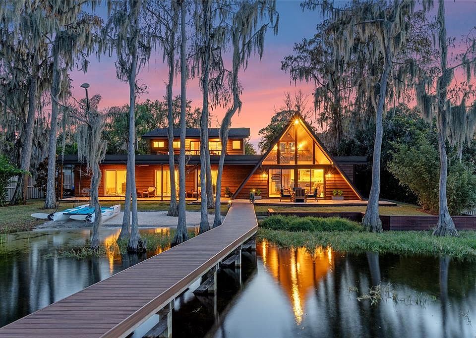BACK on the Market! Butler Chain of Lakes Vintage A-Frame - Reimagined! Perhaps one of the most distinctive styles of modern architecture, this One-of-a-Kind, custom A-Frame home is like no other in the area. This beauty is located on the South shore of Lake Tibet on approximately .75 acres, with 100 feet of lakefront, including a sandy beach, seawall, dock, and boathouse. The home was originally a 1966 A-Frame that has been reinvigorated into a modern, mid-century structure that is light-filled and imbued with drama. Painstakingly crafted into its current form using high-quality materials, the home is beautifully rustic yet modern. Soaring wood ceilings, wood & tile flooring, a custom kitchen, and an onyx candle wall are just the beginning of the special features that make this home unique, along with a showpiece Iron Shop sculptural spiral staircase leading up to an intimate loft area. Every room in the home has breathtaking lakefront views facing North through large windows and glass doors. On the main level is the custom Kitchen, Living Room, Dining Room, Breakfast Nook, Laundry Room, and Powder Bath, plus two comfortable Guest Bedrooms with lakefront views which share a Full Bath. The Primary Suite provides a retreat that you'll love, with high tongue & groove cedar wood vaulted ceilings, a large walk-in closet with a custom built-in closet system, and a striking bath with a steam shower. The Primary Suite offers lake views not only from the bedroom & bathroom but also from a large walk-out balcony, where you'll want to linger over your morning coffee or happy hour cocktails. A car lover's delight is what you'll find in this home's incredible 1,200 sq. ft. garage that has 3 bays and stacked space for additional vehicles or equipment. The garage also features unique industrial vehicular carpet flooring, a workbench, and tons of storage for any hobby. As for the home's exterior, a new extended dock with beautiful composite decking, and a covered boat house with lift, electric, & water will keep you loving the Butler Chain of Lakes lifestyle. An expansive, lakeside covered patio overlooking the lake is accessible from all ground-level lakeside rooms. The property has lush landscaping that adds significant privacy on both sides of the home, an extensive paver driveway with a 25 x 25 parking area, and a specific boat trailer storage area. Back inside, you'll find an 18 ft. long wall of storage closets with organizational shelving, perfect for all your storage needs. Other special property features include an updated septic system, dual filtration water system with Pentair soft water, and no homeowner’s association. Seller is leaving all furnishings, TVs and electronics, Nautique Ski boat., and Hobe Cat sailboat, excluding personal property, artwork (cars and tools in garage). This property is like none other!