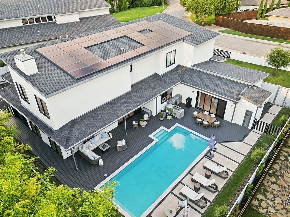 Sparkling poolBold architectural linesOutdoor kitchenCutting-edge technologyAdjacent spaSeamless flowExpansive glass doors