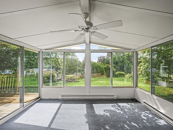 The all-window, heated sunroom is a standout feature, providing a sunlit retreat that opens via sliding glass doors to both the deck and the kitchen. It’s an ideal spot for year-round relaxation, offering views of the backyard and creating a seamless connection between indoor and outdoor spaces.