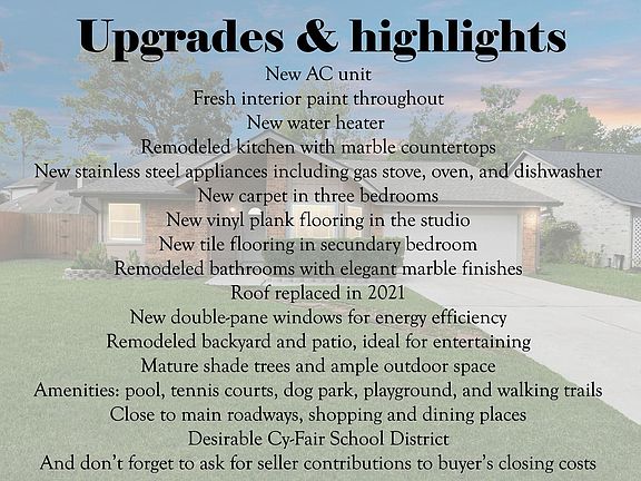 Welcome to this beautifully renovated home in the established Winchester Country subdivision, ideally located on a spacious corner lot. This move-in ready property offers a perfect blend of charm, functionality, and modern upgrades, like fresh interior paint throughout, new carpets in secondary bedrooms, & new tile flooring in the studio and main suite. The ample kitchen has new SS appliances and marble countertops. The bathrooms have elegant marble finishes too. Take note of the NEW water heater, NEW AC unit & NEW double-pane windows for energy efficiency. Your backyard with mature shade trees and the recently remodeled patio paradise, are ideal for entertaining. This home is vacant and ready for immediate move-in. Don’t miss the opportunity to own a fully updated property in a desirable neighborhood with amenities like pool, tennis courts, dog park, playground, and walking trails, & easy access to everything Houston has to offer.