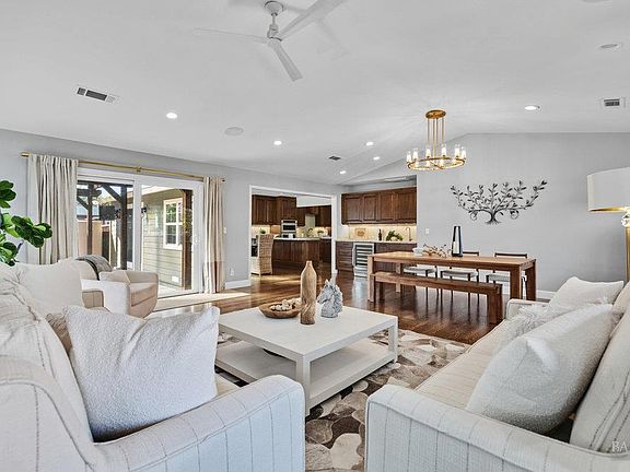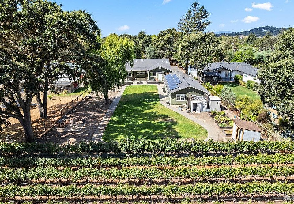 Country living in Coombsville! This rare .40-acre Berry Lane property is framed by vineyard and hillside views and offers a single-level home with 4 bedrooms and 3 baths plus a detached guest cottage. The flexible floor plan includes both a living and family room, with the front family room featuring custom built-in cabinetry. At the heart of the home, the kitchen shines with abundant cabinetry, stainless appliances, gas range, center island with seating, breakfast nook, and a custom wine cellar. Hardwood flooring flows throughout much of the home, leading to a spacious primary suite with vineyard views, backyard access to the hot tub, a large walk-in closet, and a recently updated spa-like bath featuring dual vanities and a tiled steam shower. A guest bedroom with en suite bath and walk-in closet adds comfort, while an additional bedroom, guest bath, and separate office provide versatility. The detached two-car garage includes a 1 bed/1 bath guest cottage with vineyard viewsideal for extended family, guests, or a private office. Outdoor living shines with an expansive lawn, raised garden beds, chicken coop, hot tub, and owned solar, making this East Napa property a perfect blend of comfort, functionality, and Wine Country lifestyle.