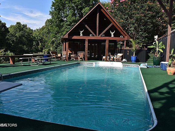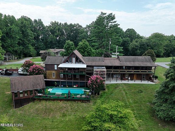 Welcome to your dream retreat on 6.5 acres in the picturesque hills of East Tennessee. This beautifully crafted home offers 3 bedrooms, 3 bathrooms and captivating mountain views. Situated on a paved road, the property features expansive decks perfect for entertaining or unwinding by the outdoor fireplace while taking in the serene surroundings. The main level of the home boasts a large, open kitchen and dining area, equipped with stainless steel appliances, custom cabinets, and ample counter space. Enjoy the inground pool with a nearby changing cabin, and a lower property area designed for leisure with a salon furnished with a card table, bar, and pool tables. Additionally, the property includes a rustic cabin with running water and electricity (not intended for full-time living), a charming one-room church, and a sizable man-made pond. This unique property offers incredible potential for transformation into a private retreat or rental property with some updates and upgrades. There is plenty of parking spaces with the attached 3-car garage on the main level and multiple covered carports for all your boats, ATVs and other automobiles. You even have space to park an RV. This is a true mountain retreat with its incredible views conveniently located less then 45 minutes from Knoxville and about an hour to the Great Smokey Mountains.