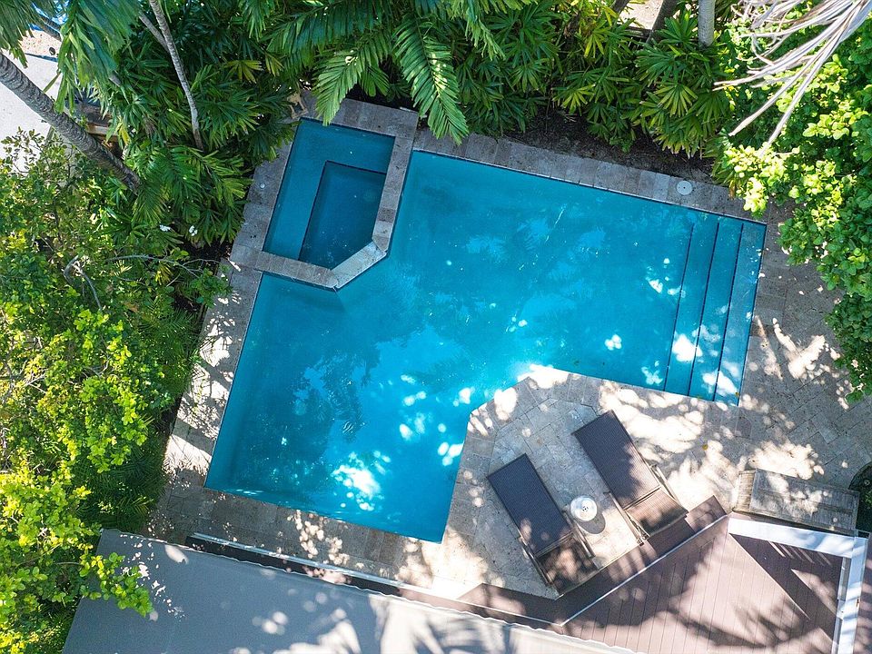Multi-vehicle carportLarge pool and spaAdditional dining tableLush landscaping