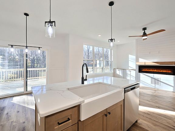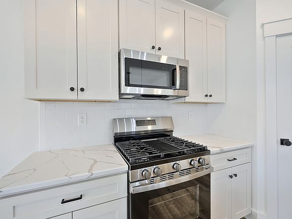 Electric fireplaceQuartz countertopsModern finishes throughoutAbove-range microwaveBright open-concept layoutTile backsplashSide-by-side refrigerator