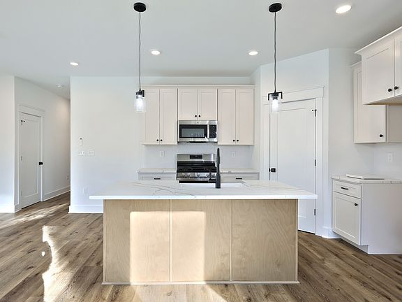 The first floor offers a bright, open-concept layout with quartz countertops, tile backsplash, soft-close cabinetry, and a beautiful kitchen island with breakfast bar. The kitchen includes stainless steel appliances such as a side-by-side refrigerator, gas stove, above-range microwave, dishwasher, and garbage disposal, along with a walk-in pantry for extra storage. A spacious mudroom with a large closet connects the living area to the garage. Also on the first floor is a half bath, a bonus room perfect for an office, and a private rear deck with wooded views, ideal for relaxing or entertaining.