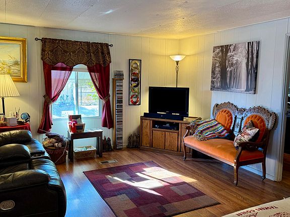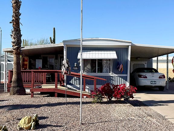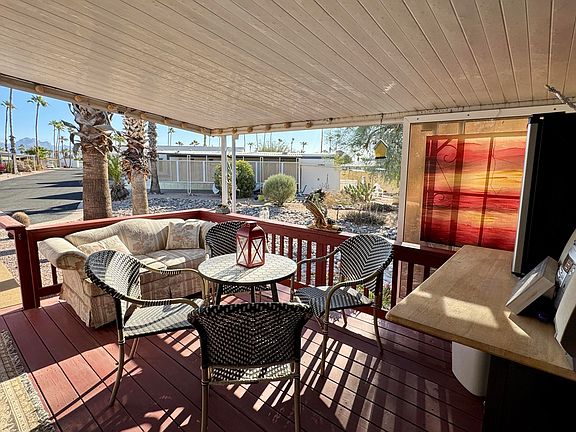 55+ lovely furnished snowbird retreat with 2 new redwood decks, and mountain views! 1 bedroom, 1.25 bath home on a quiet cul-de-sac in Pacific Manor where neighbors have become friends who gather round the bocci court for friendly competition and laughs. Spacious lot adjacent to the wash gives tons of open space. 10'x16' building could be a bunkhouse, craft room, or She Shed. 8'x12' workshop in the carport has workbench and room for bike storage. Large remodeled eat-in kitchen with solid wood cabinets. Off-street parking for 3 vehicles. All appliances including washer, dryer, fridge, most furnishings & household items convey w/ home. The 1/4 bath could easily be restored to a 1/2 bath. Updated wiring, plumbing, and flooring. Low taxes and lot rent. Tons of storage.