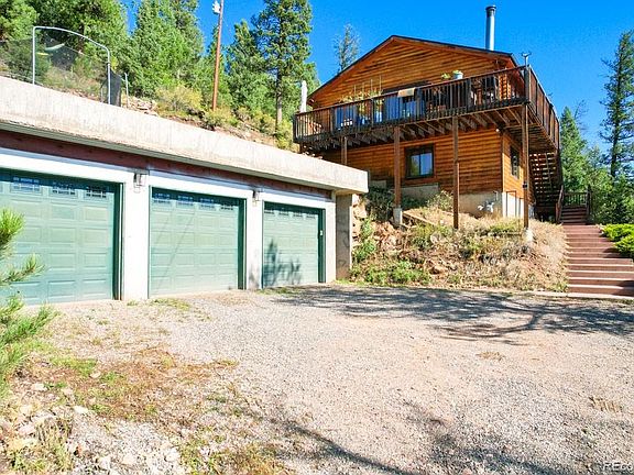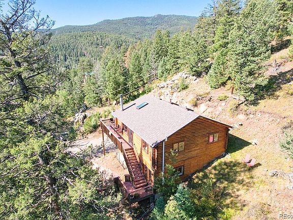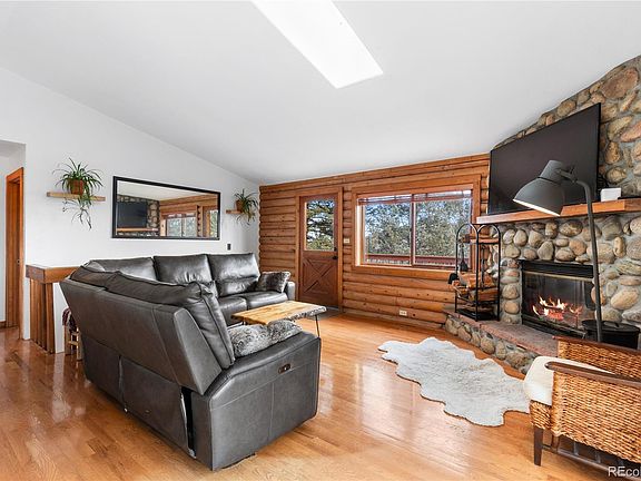 Experience true mountain living in this charming log home on over two private acres in Conifer, CO on a sunny south facing lot. Perched above the other homes on Blue Sky Trail, this property offers breathtaking, unobstructed views of the foothills and ultimate privacy. The oversized three-car garage provides ample storage for vehicles, outdoor gear, or a workshop. Inside, the open-concept living, dining, and kitchen area is perfect for entertaining, with stainless steel appliances in the kitchen, a cozy fireplace in the living room, and expansive windows that flood the space with natural light. Step outside onto the wrap-around deck to take in the sweeping vistas or access the functional flat yard, ideal for kids, dogs, or outdoor gatherings. Upstairs, you'll find two spacious bedrooms and a full bathroom with a skylight, adding warmth and brightness. The walkout basement features a third bedroom, another full bathroom, a laundry room, and a flexible living space that can serve as a home office, gym, additional living room, or entertainment room. Enjoy the recently added laminate flooring to the basement to make an additional living space. This home offers the perfect blend of rustic charm and modern convenience, located just minutes from grocery stores and restaurants in Aspen Park and Conifer, and only 35 minutes from Denver.