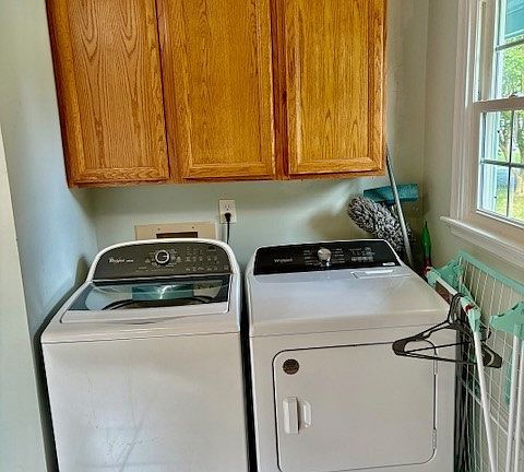 has Formal Living and Dining rooms, Eat-In Kitchen and Family Room w/Brick Raised Hearth Fireplace w/Gas Log insert (propane), plus spacious Laundry room with Cabinets and Counter and Powder room. The Whirlpool Washer and Dryer convey "as-is."