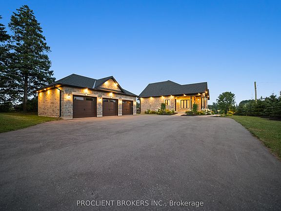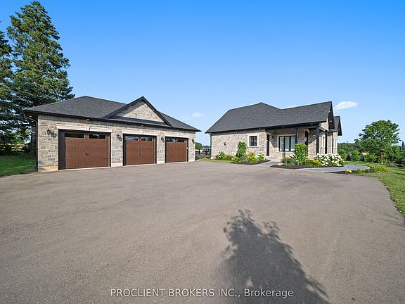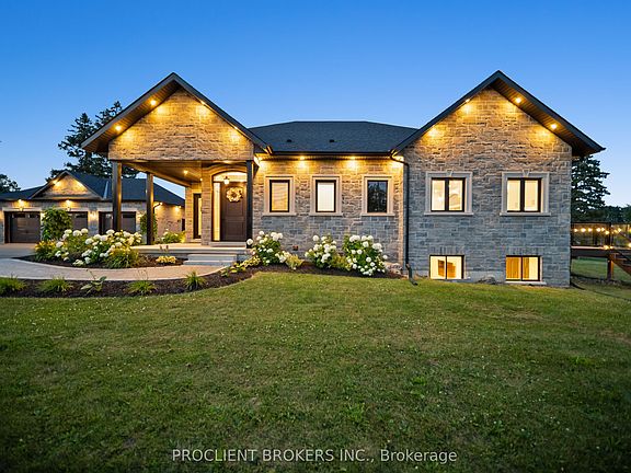 MUST SEE VIRTUAL TOUR - CLICK MULTIMEDIA - Contemporary elegance meets estate living. Situated on a beautifully manicured 1.11-acre lot, this custom-built 2022 bungalow delivers nearly 5,000 sqft of meticulously designed living space, with 5 beds, 5 baths, and an oversized 3-car garage. Just 3 minutes from Hwy 401, this luxury residence offers seamless access while surrounded by privacy and natural beauty. Inside, you'll find 10ft flat ceilings, solid 8ft doors, and refined craftsman-style millwork throughout. The designer kitchen is a showpiece with a massive quartz island (4x9ft), floor-to-ceiling custom cabinetry, and premium built-in appliances. Ideal for everyday living and upscale entertaining. The great room stuns with a 17ft cathedral ceiling, exposed wood beams, a 42" Napoleon fireplace, built-inParadigm surround sound, and oversized patio doors leading to a glass-railed composite deck. A stylish family room offers a second 72" fireplace and in-ceiling audio for immersive ambiance. The primary suite isa private sanctuary with its own fireplace, custom walk-in closet, luxury ensuite, and French doors to the rear deck. Every bedroom on the main floor includes built-in audio and custom closets. The fully finished 9ft ceiling basement redefines modern living with engineered hardwood, a custom-built library with ladder, wet bar, and two spacious bedrooms each with its own ensuite. At its heart is a $100K+ professionally built11-channel 8-seater home theatre, fully insulated for premium acoustics. Outdoors, the property is a masterpiece: two composite decks with gas hookups, landscape lighting, a fire pit, volleyball setup, and an apple & pear orchard, complemented by fruit trees, berry patches, and grape vines. The garage is EV ready(for 2), fully insulated, with premium carriage-style doors, built-in racks, and Pro-slat tool walls ideal for car lovers or hobbyists. This is more than a home, its an experience. A retreat. A lifestyle. And it's ready for you.