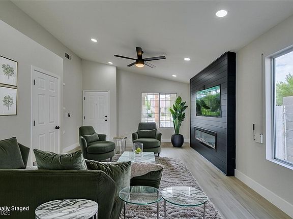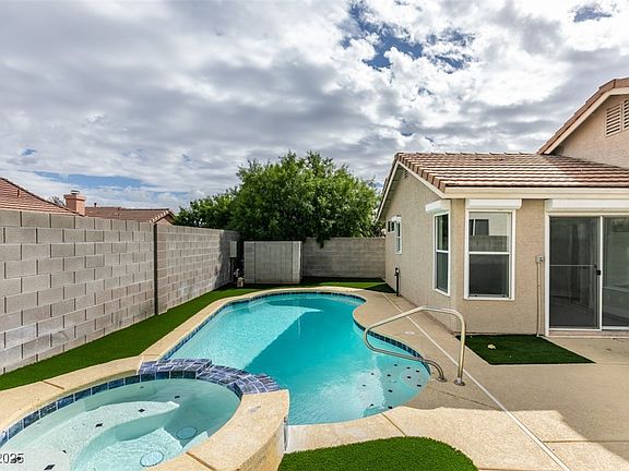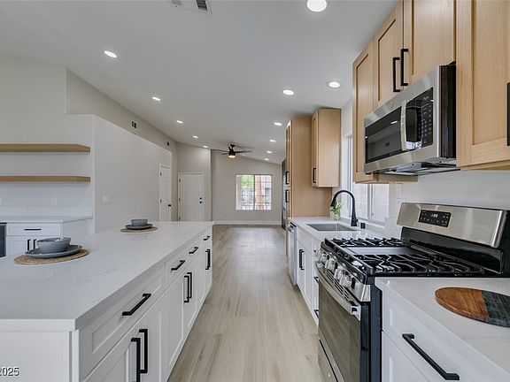 Stunning single story Summerlin home with pool & spa! This open concept remodel features vaulted ceilings, white oak & white shaker cabinets, quartz countertops, and stainless steel appliances. Entertain in style with a bar area and floating shelves. Relax by the custom floor-to-ceiling fireplace that anchors the living space. Rolladen shutters throughout add privacy, security, and energy efficiency. Bathrooms showcase porcelain Calacatta slab showers contrasted by warm oak tile and frameless glass enclosures. Finished with luxury vinyl plank flooring, 5" baseboards, and all new lighting, fans, and fixtures—this turnkey Summerlin retreat is ready to impress!